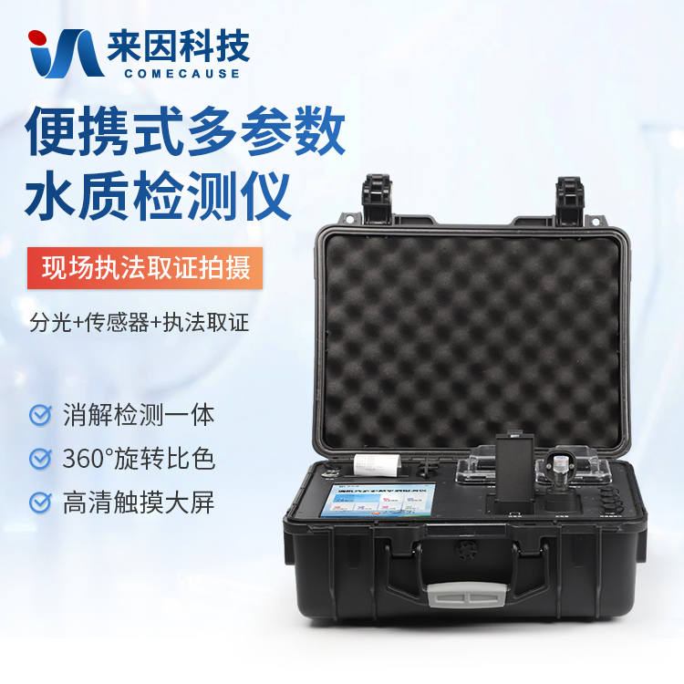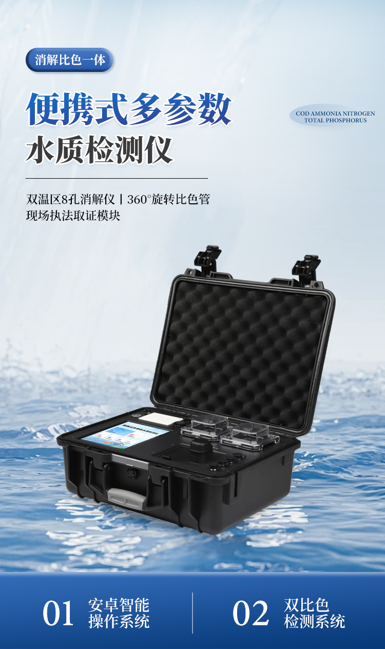 简要描述: 便携一体式多参数水质检测仪采用高强度PVC工程塑料手提箱设计,消解检测一体式设计,其中消解模块具备双温区功能,检测部分同时具备360°旋转比色管检测和比色皿检测,安卓智能操作系统,8英寸高清液晶触摸屏,光纤检测技术,进口光源,内置大容量锂电池,现场执法取证模块,便携多参数水质检测仪具有性能稳定、测量准确、测定范围广、功能强大、操作简单等特点。