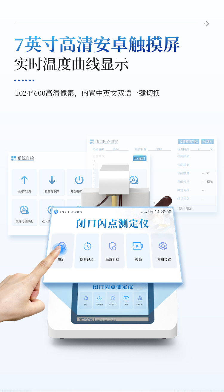 简要描述: 全自动开口闪点和燃点测定仪主要用于石油产品和其他易燃液体在特定条件下,与空气混合后遇火源发生闪火和燃烧的最低温度的仪器。