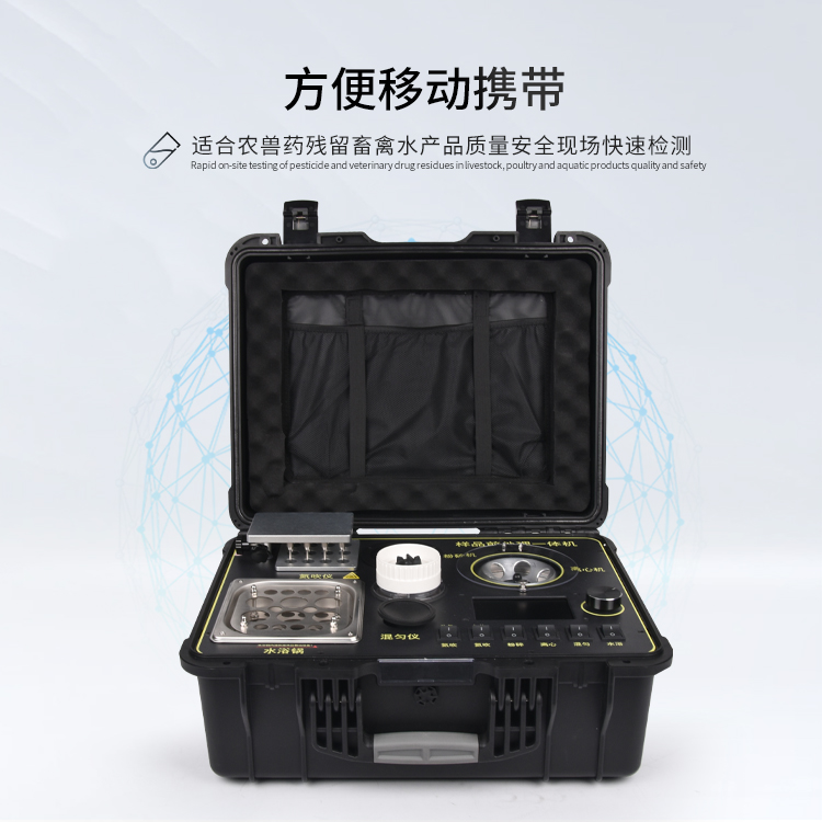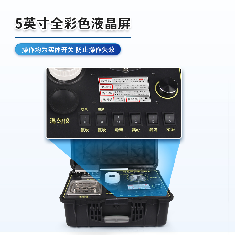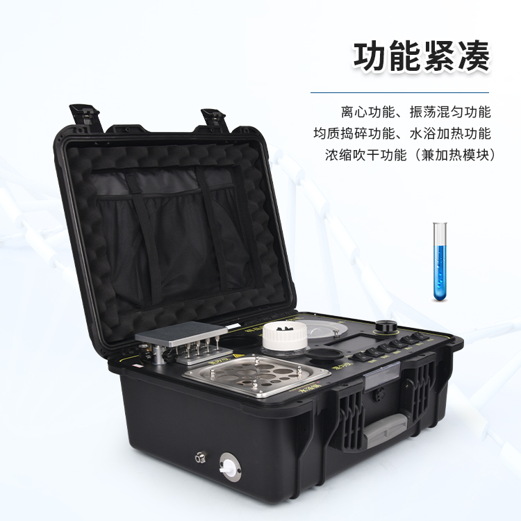 应国内用户的实际需求,自行研制开发的新型仪器——QC05B型样品前处理一体机。样品前处理集成箱将样本前处理过程中样品浓缩、水浴恒温、离心分层、均质、振荡混匀等步骤所需设备进行集成,仅需一台样品前处理集成箱设备即可完成所有样本前处理过程,并且方便携带,不仅适用于现场检测使用,还可用于色谱、质谱等分析样品的纯化和制备。
