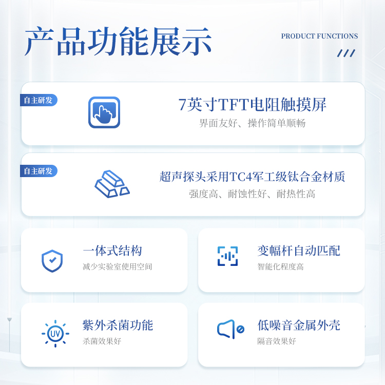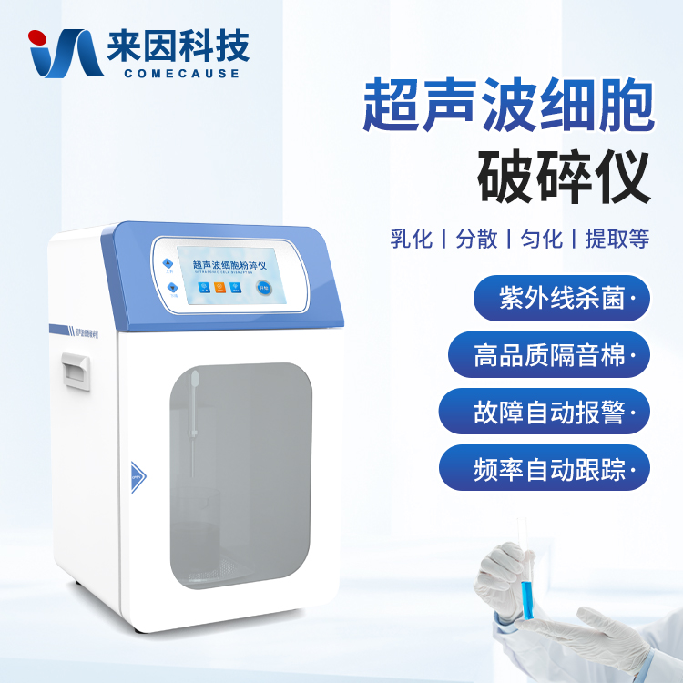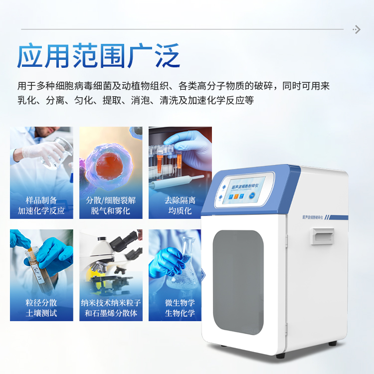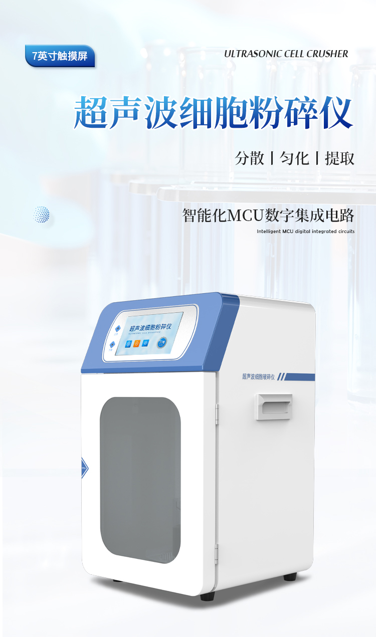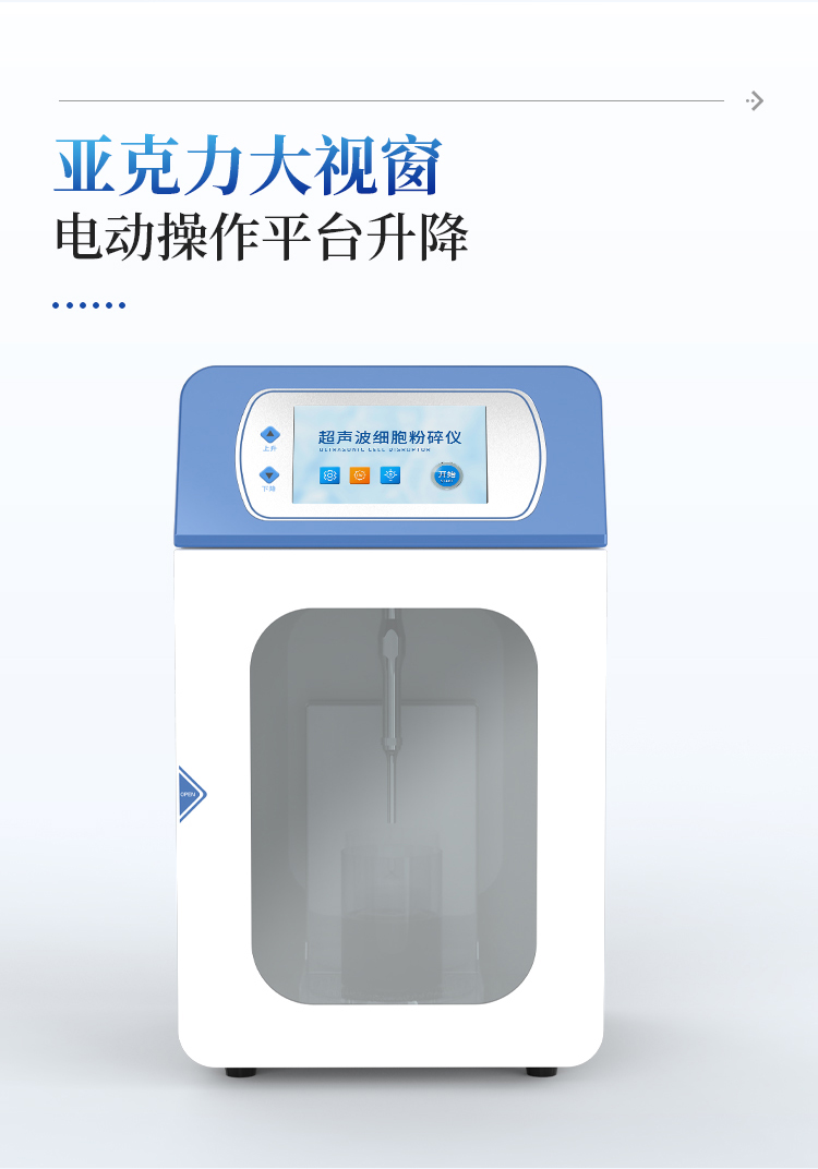 超声波细胞粉碎仪(一体式)将隔音箱融入到主机中形成一体化。功能齐全、外观新颖、性能可靠。仪器采用大屏液晶显示;中央微机集中控制,超声输出、间隙时间、超声功率、温度可任意设定,样品温度监测显示,频率自动跟踪,故障自动报警等功能。
