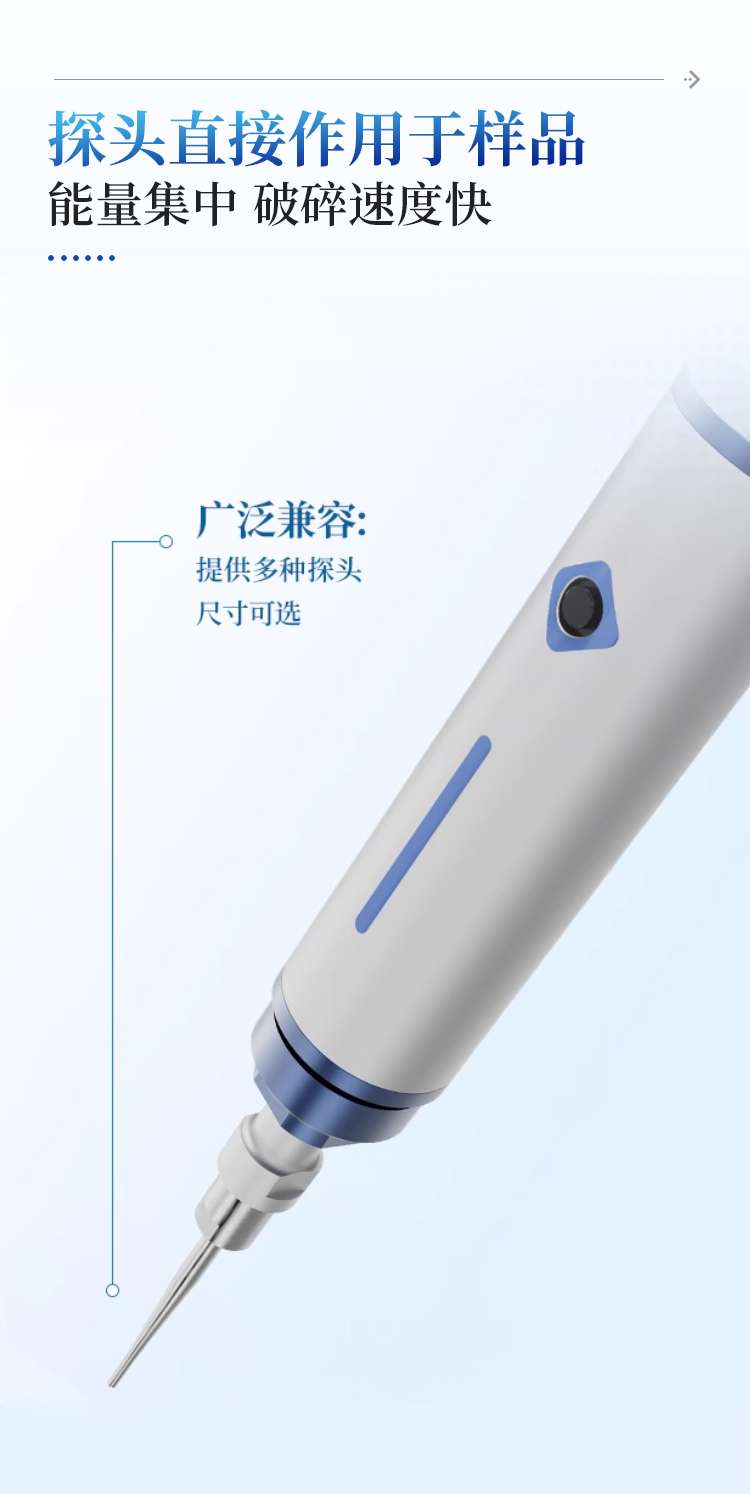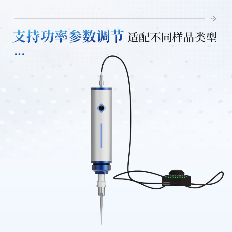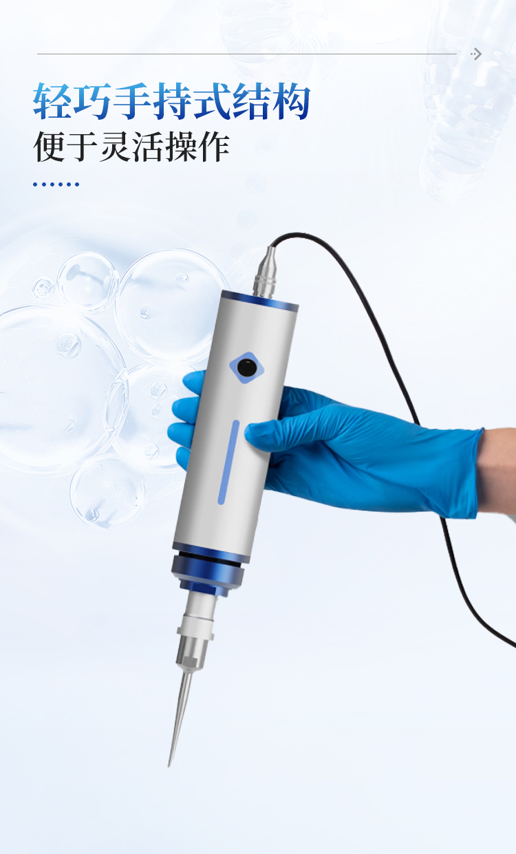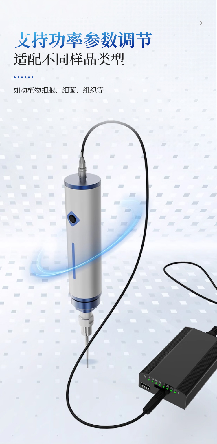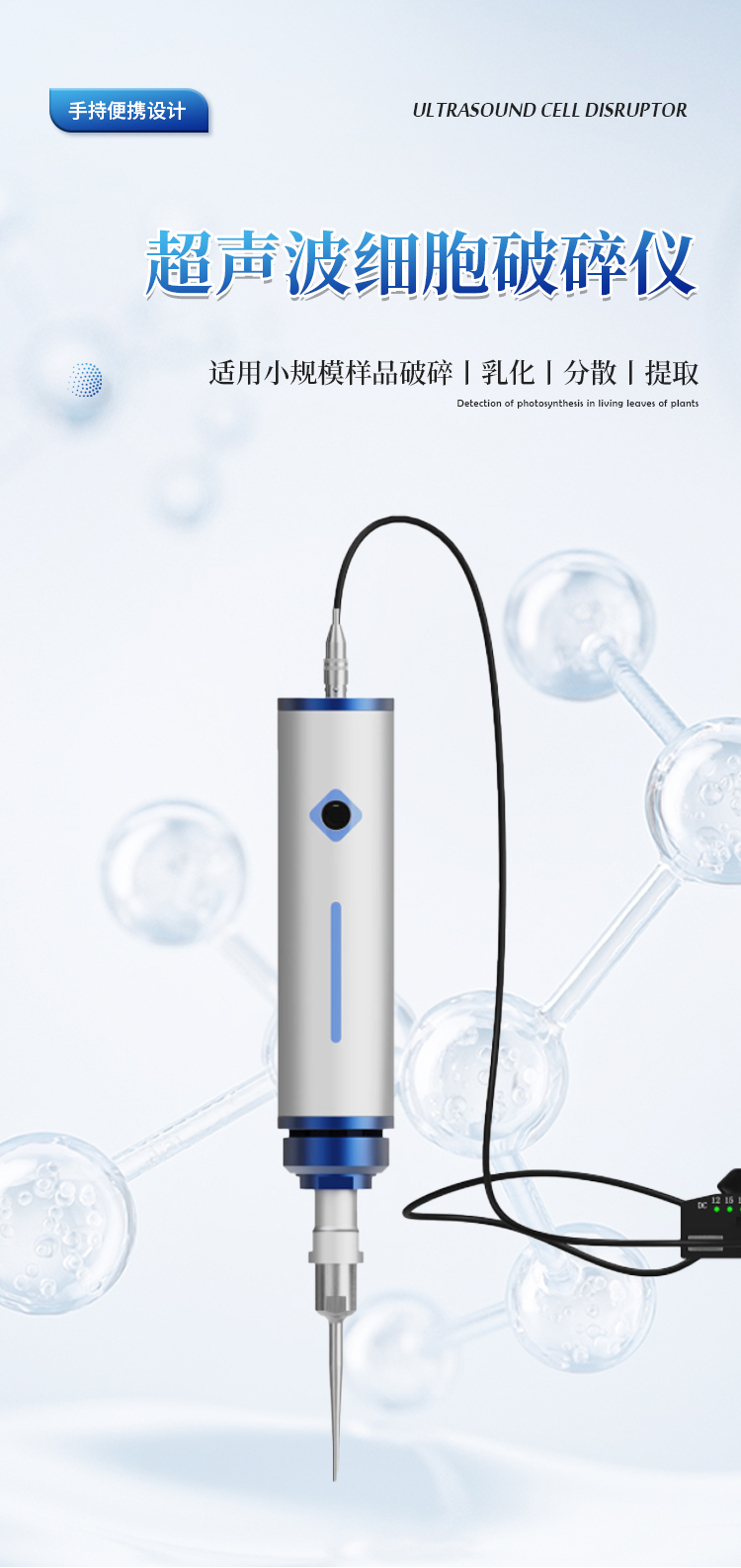 简要描述: 手持超声波细胞破碎仪是一种便携式、高精度的超声波处理设备,适用于实验室小规模样品破碎、乳化、分散和提取等操作。其一体化设计集成了超声波发生器和换能器,操作灵活,可手持使用或搭配支架固定,适用于生物、化学、材料等领域的高效样品处理。 超声波细胞破碎仪是一种利用强超声在液体中产生空化效应,对物质进行超声处理的多功能、多用途的仪器,能用于动植物组织、细胞、细菌、芽胞菌种的破碎,同时可用来乳化、分离、分散、匀化、提取、脱气、清洗及加速化学反应等等。