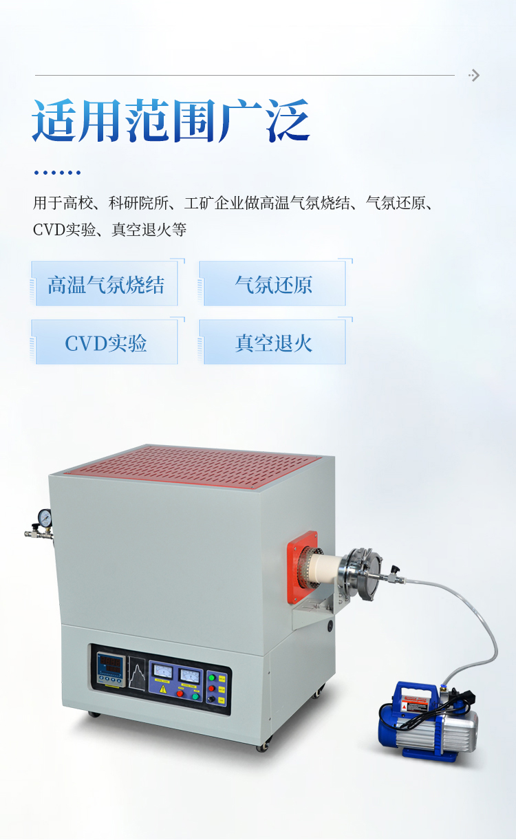 用于高校、科研院所、工矿企业做高温气氛烧结、气氛还原、CVD实验、真空退火等。