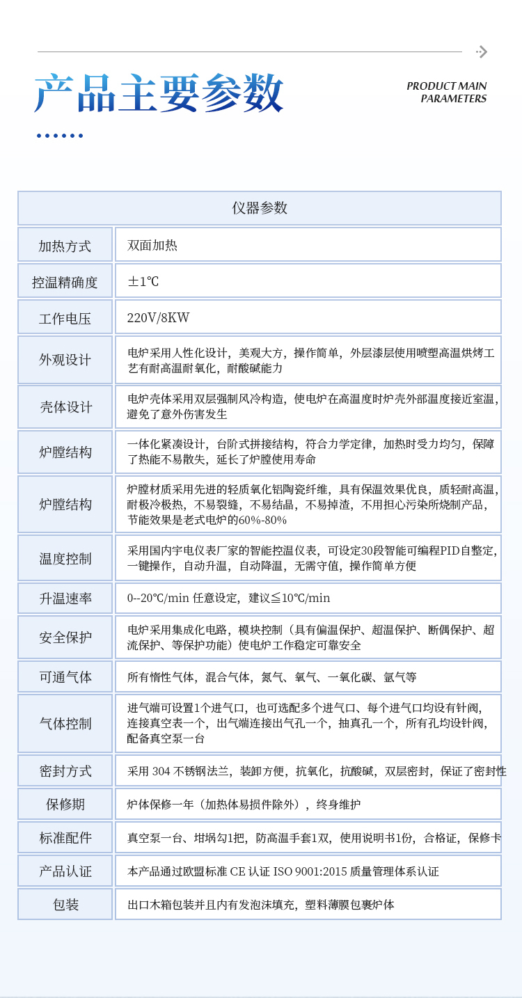 | 保修期 | 炉体保修一年(加热体易损件除外),终身维护 |