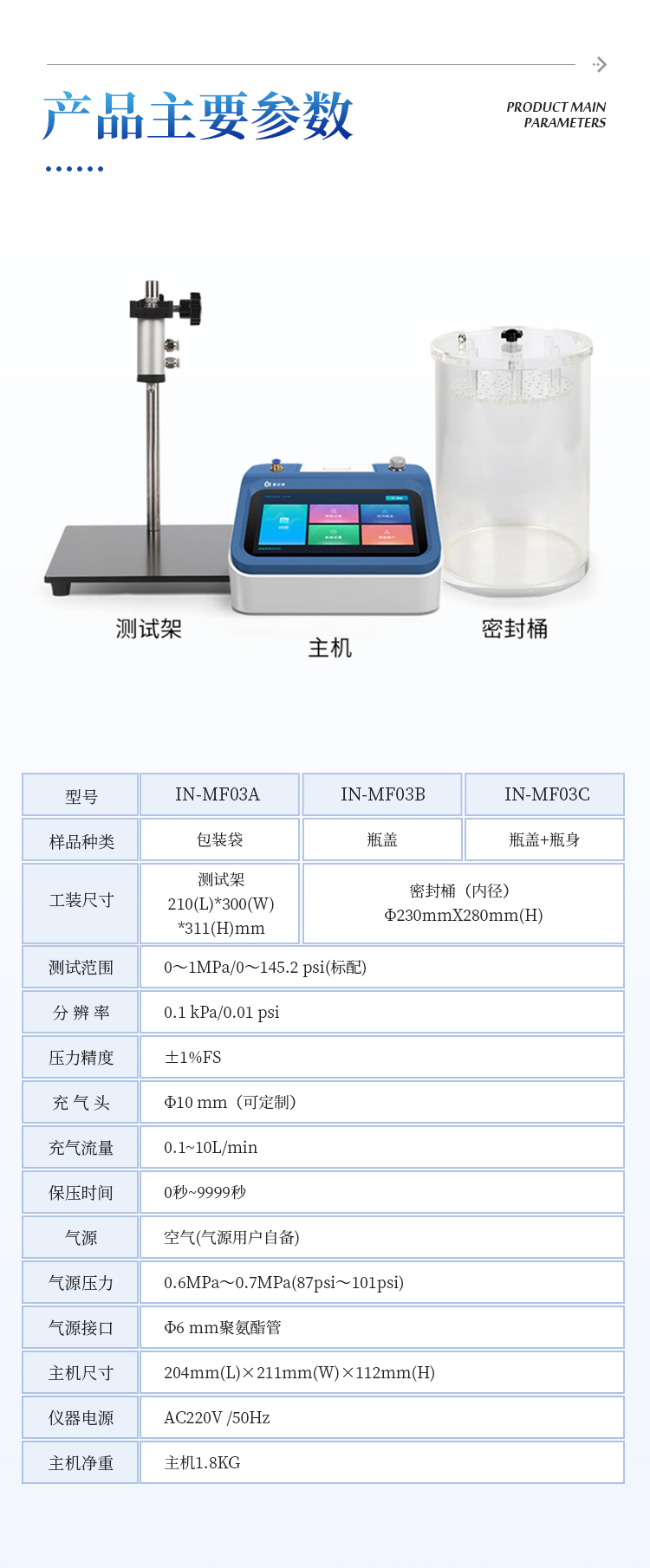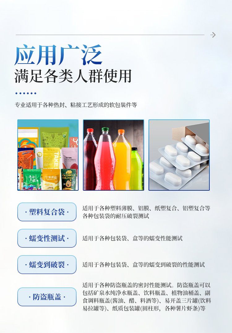 | 泡罩包装破裂测试 | 适用于各种泡罩包装的耐压测试 |