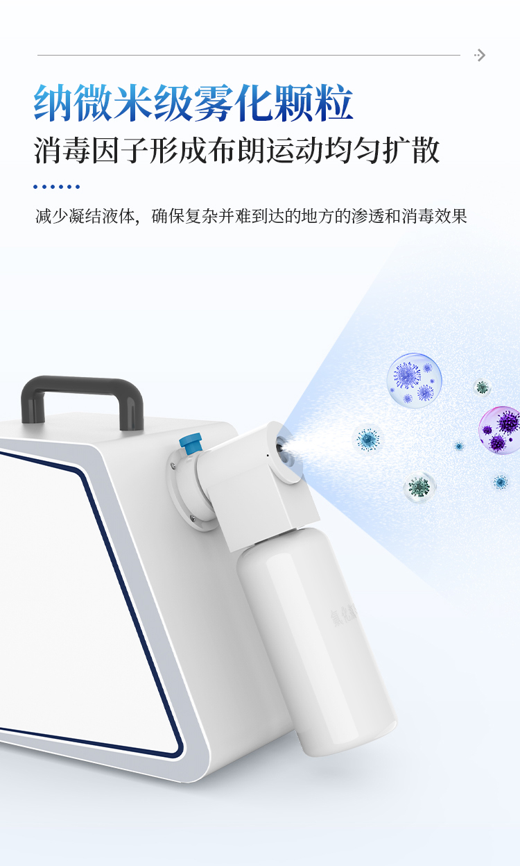 3、微米级雾化颗粒,消毒因子形成布朗运动,均匀扩散。