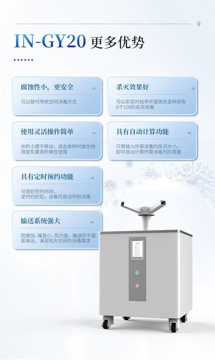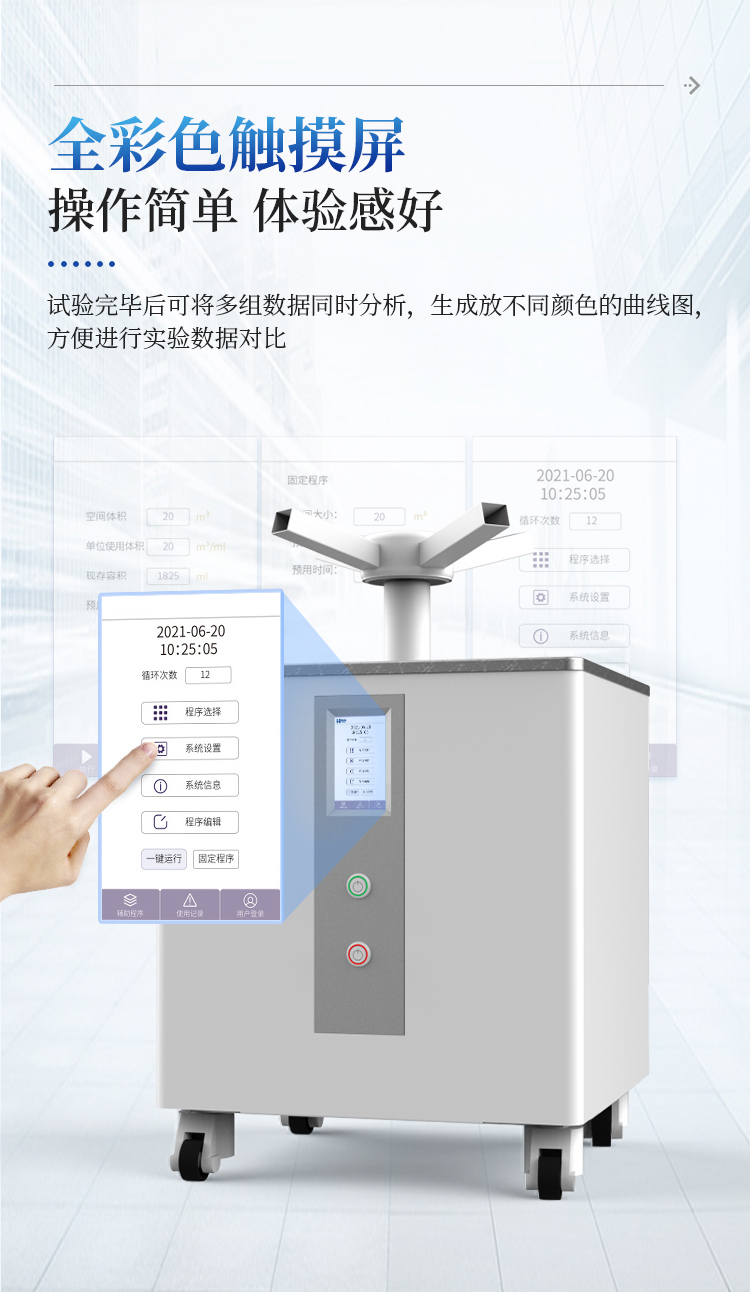 过氧化氢消毒机利用低浓度的过氧化氢消毒剂来实现消毒效果;主要用于室内环境和中央空调系统,可快速杀灭封闭空间中空气和物体表面的空气自然菌、白葡萄球菌。使用低浓度的过氧化氢,每立方米仅需几毫升的用量,且环境湿度仅上升少许。在消毒过程中,无需加热、中和等过程,方便快捷。广泛应用于医院、疾控中心、实验室、生物制品等领域。
