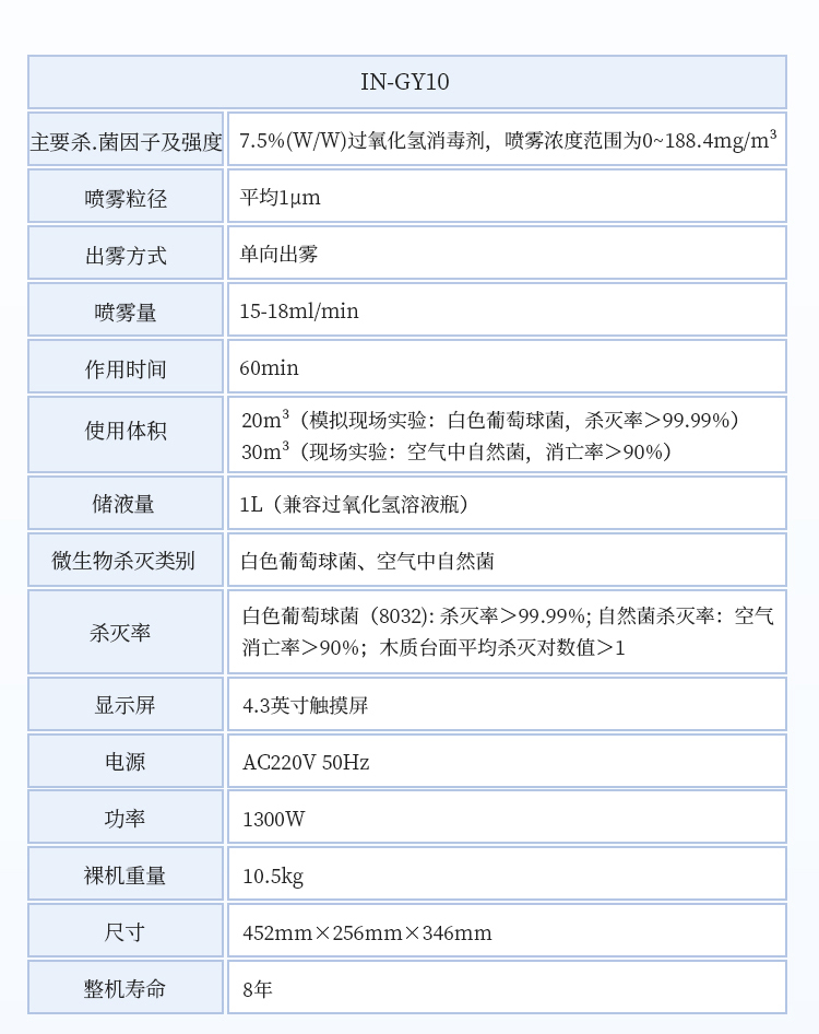 1、主要杀菌因子及其强度:7.5%(W/W)过氧化氢消毒剂,喷雾浓度范围为0~188.4mg/m³