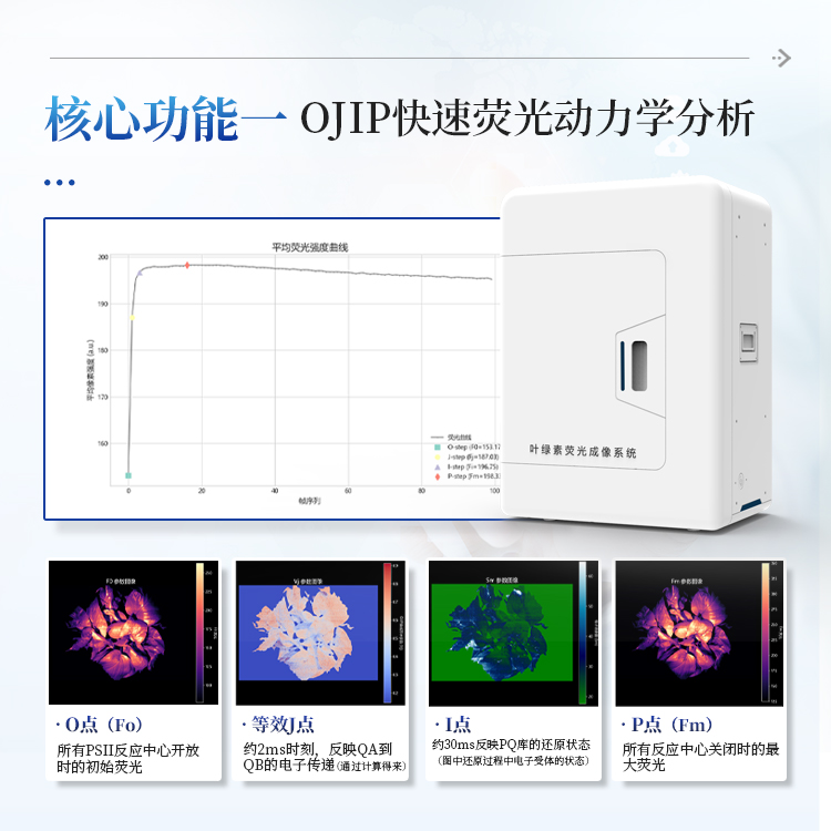 测量原理: 暗适应后的植物叶片在强光照射下,PSII反应中心QA从氧化态逐渐被还原,导致荧光强度快速上升。这一过程反映了电子传递链的效率和PSII反应中心的数量与活性。