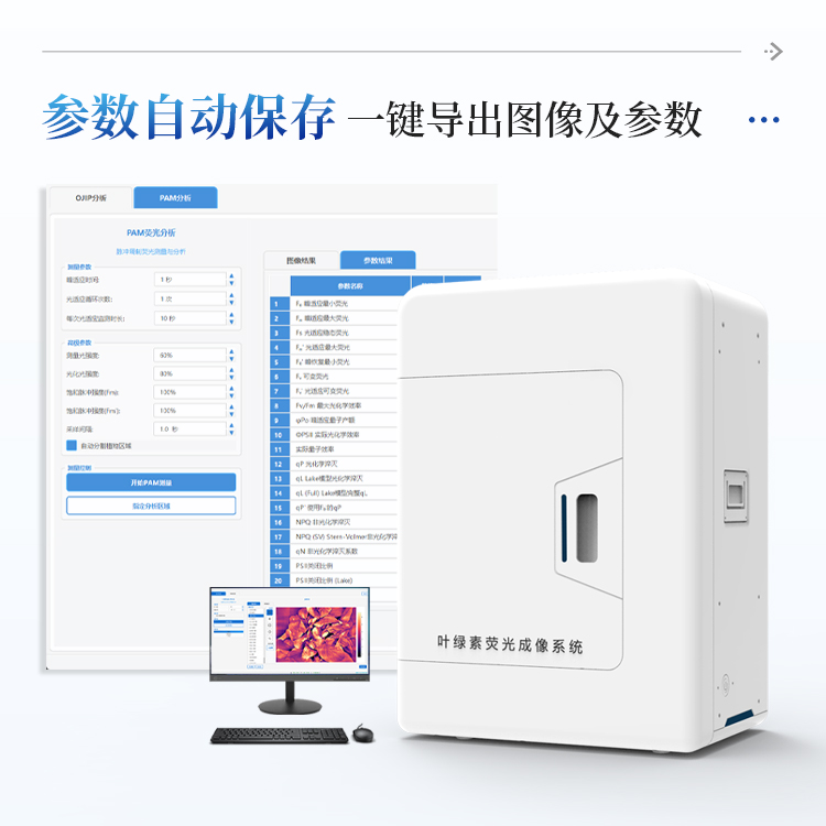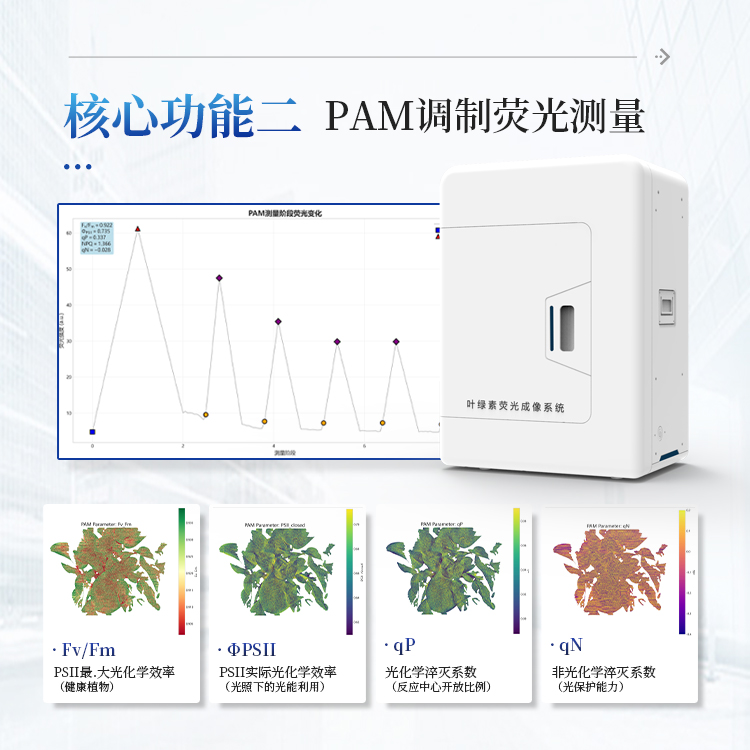 叶绿素荧光成像系统是一款专业的植物光合作用研究仪器,采用高灵敏度CMOS相机和LED光源控制,实现对植物叶片叶绿素荧光的快速、无损检测与成像分析。系统集成了OJIP快速荧光动力学测量和PAM调制荧光测量两大核心功能,能够全面评估植物光合系统的活性、光能利用效率以及环境胁迫响应。
