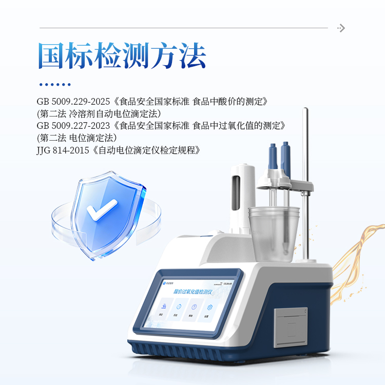 简要描述: 本仪器基于自动电位滴定技术,专用于食品中酸价和过氧化值的精准测定。遵循食品安全国家标准预置酸价与过氧化值标准化检测程序,搭配高精度滴定系统,实现“一键检测”,同时兼具常规滴定模式。可为食品企业、质检机构及科研院所提供油脂氧化稳定性评价解决方案。