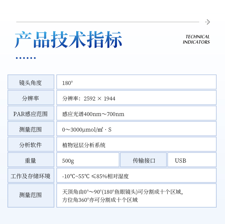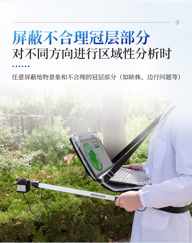 植物冠层图像分析仪根据各种图像处理手段提取多个角度的冠层间隙率,采用装配鱼眼镜头的相机从树冠下向上拍摄冠层照片,利用间隙率参数来反演出各种冠层参数,导田园合理施肥、现代化农场高效管理提供可靠的科学依据,广泛应用于农业、林业、植物等科学研究和生产指导。