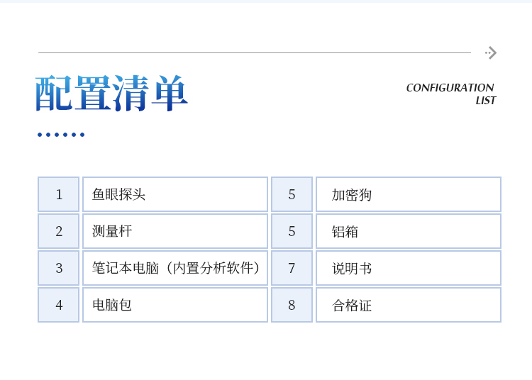 10. 配置清单:鱼眼探头180°、测量杆、笔记本电脑(内置分析软件)、电脑包、加密狗、铝箱、说明书,合格证