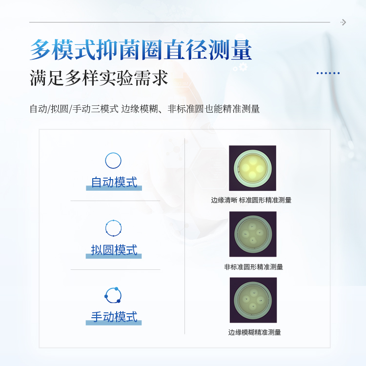 本产品是一款集图像采集、数据处理与统计分析于一体的全自动菌落计数及抑菌圈测量仪,广泛应用于食品、药品、化妆品、环境监测、医疗卫生、科研院校等领域。仪器采用先进的数字图像处理技术,具备荧光菌识别、抑菌圈测量及效价测定和杀菌功能,可快速精准完成培养皿内菌落的测量分析、抑菌圈测量及抗生素效价测定,大幅提升实验效率,有效降低人工操作误差。