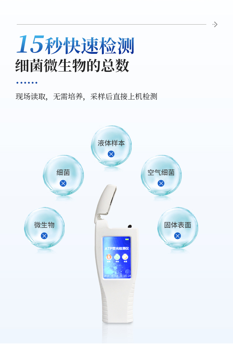 ATP荧光检测仪广泛应用于:细菌微生物检测、医药卫生、食品安全、市场执法、表面洁净度检测、医疗防疫、水质水政、生产线卫生、工业水处理、环保检测、海关出入境检疫及其他执法部门等多种行业。
