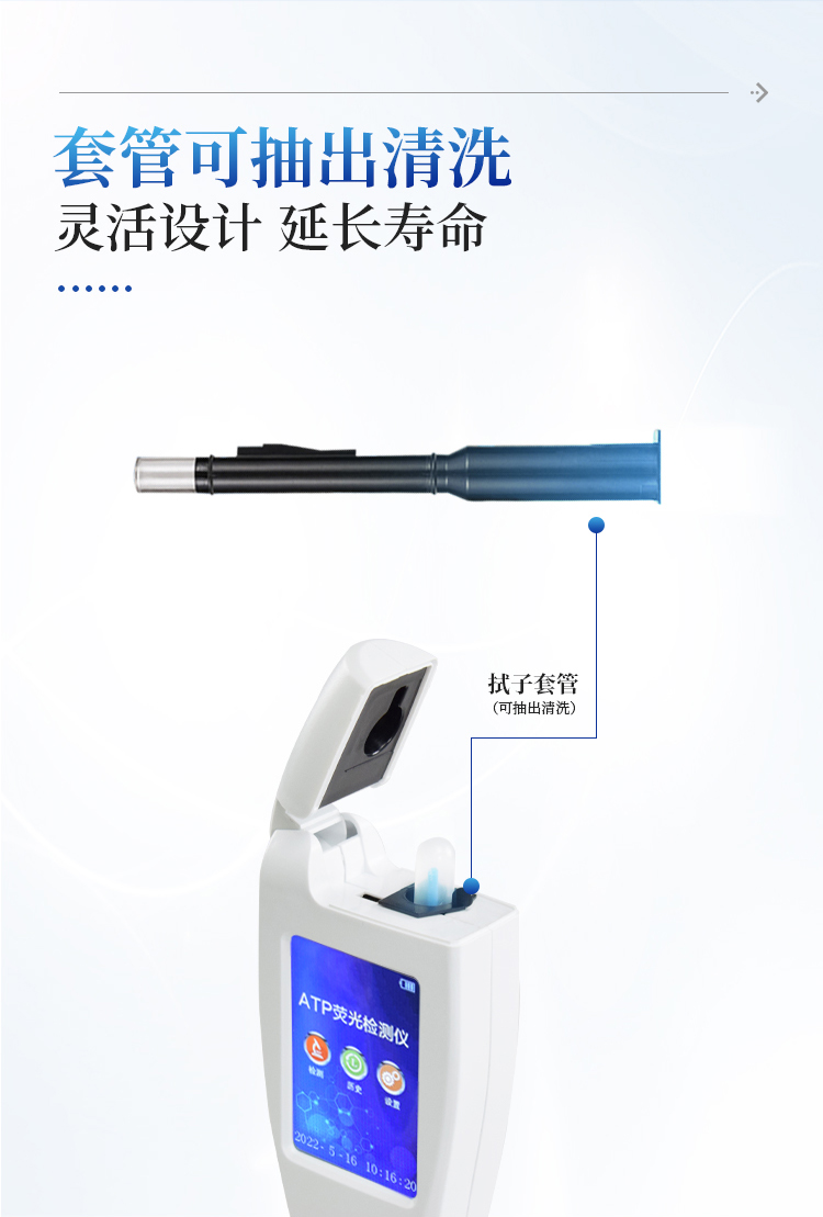 该设备为全新升级产品,安卓智能操作系统。操作采用生物化学反应方法检测ATP含量,ATP荧光检测仪基于萤火虫发光原理,利用“荧光素酶—荧光素体系”快速检测三磷酸腺苷(ATP)。ATP拭子含有可以裂解细胞膜的试剂,能将细胞内ATP释放出来,与试剂中含有的特异性酶发生反应,产生光,再用荧光照度计检测发光值,微生物的数量与发光值成正比,由于所有生物活细胞中含有恒量的ATP,所以ATP含量可以清晰地表明样品中微生物与其他生物残余的多少,用于判断卫生状况。
