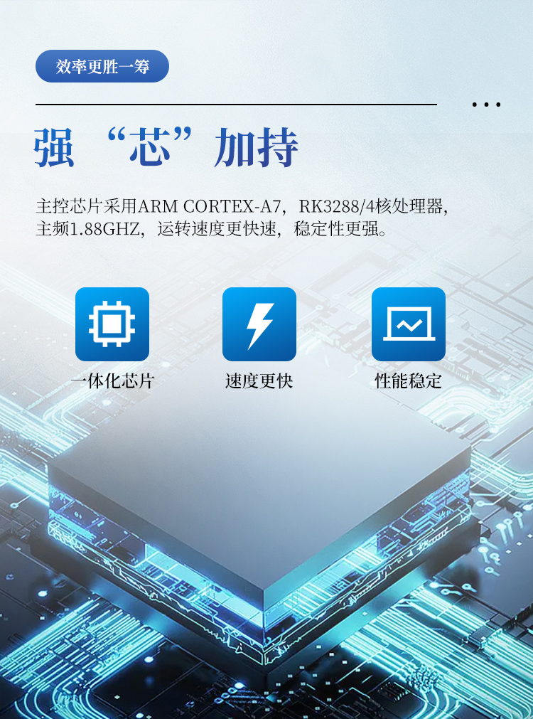 1、主控芯片采用ARM Cortex-A7,RK3288/4核处理器,主频1.88Ghz,运转速度更快速,稳定性更强。