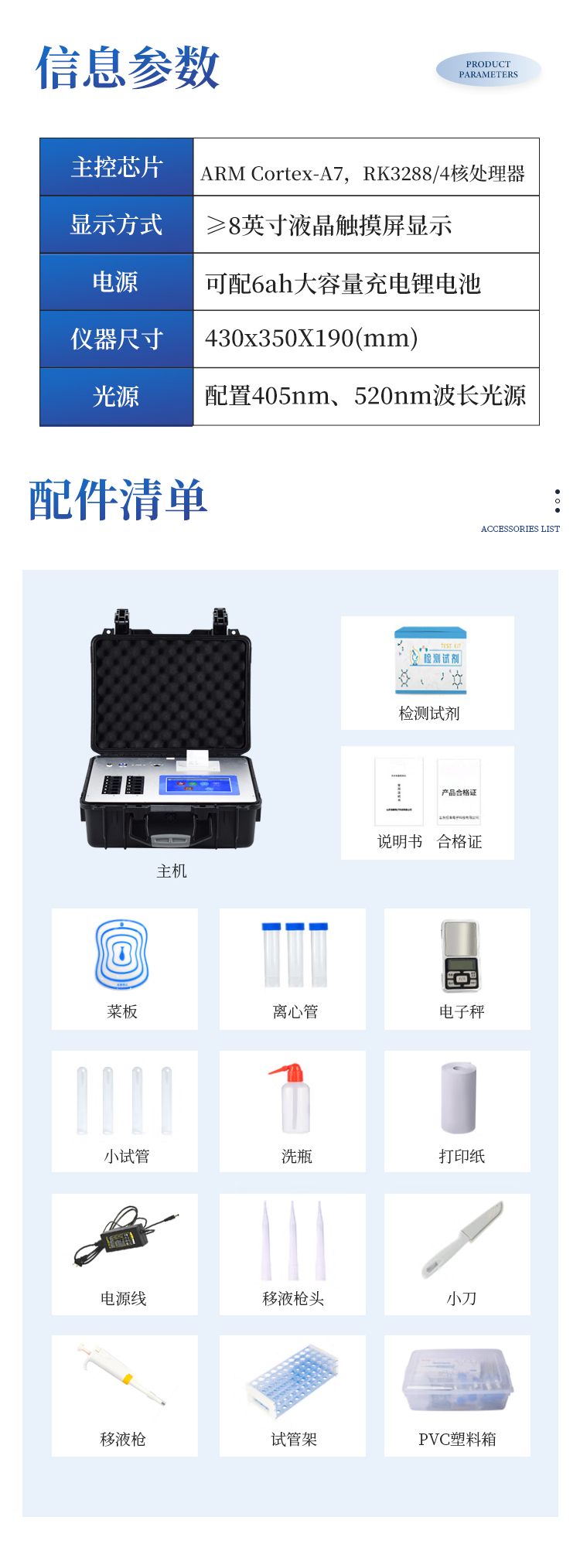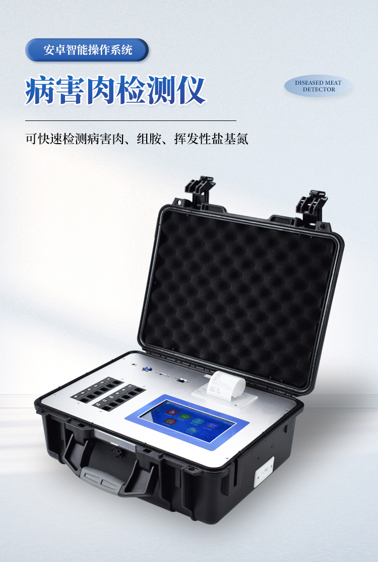 可快速检测病害肉、组胺、挥发性盐基氮,仪器预留其他项目检测程序和端口,根据日后需求可方便的自主增加检测项目。