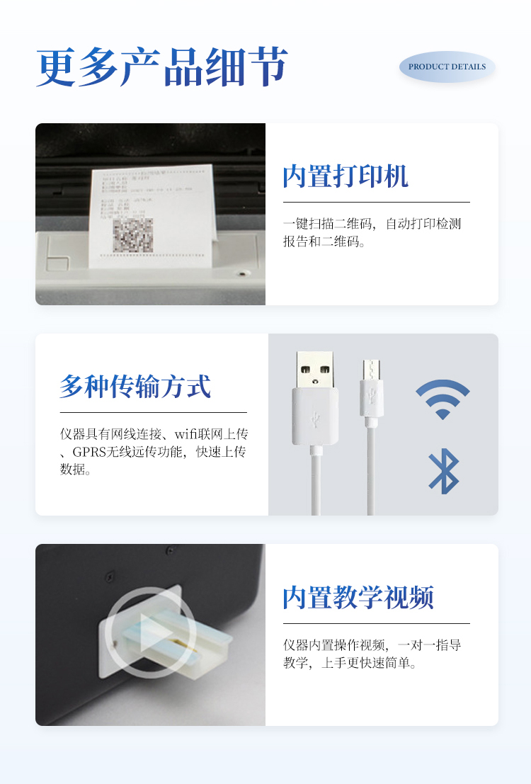 1、安卓智能操作系统,采用更加高效和人性化操作,仪器具有网线连接、wifi联网上传、GPRS无线远传功能,快速上传数据。