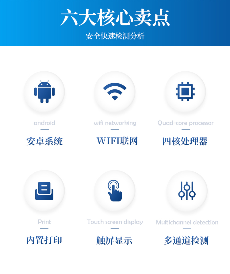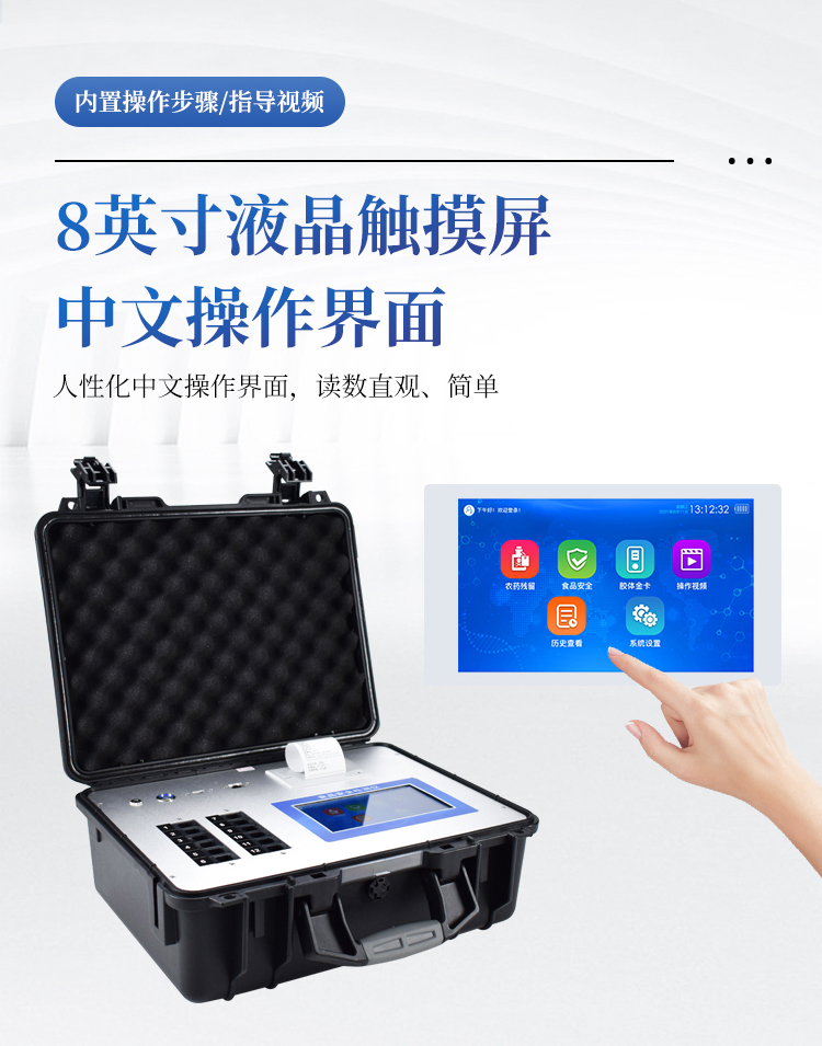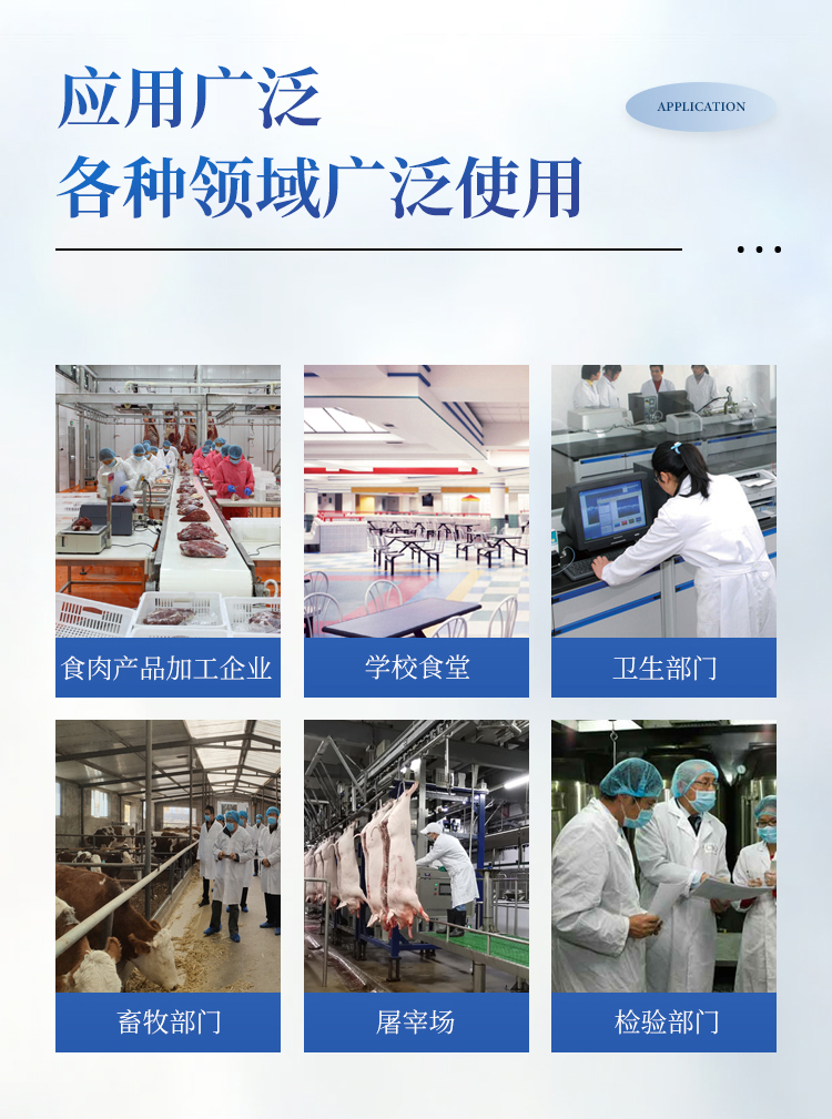 该多功能食品安全检测仪为集成化食品安全快速检测分析设备,广泛应用于市场监管局、食品肉产品深加工企业、学校食堂、卫生部门、畜牧部门、屠宰场、检验检疫部门等单位使用。