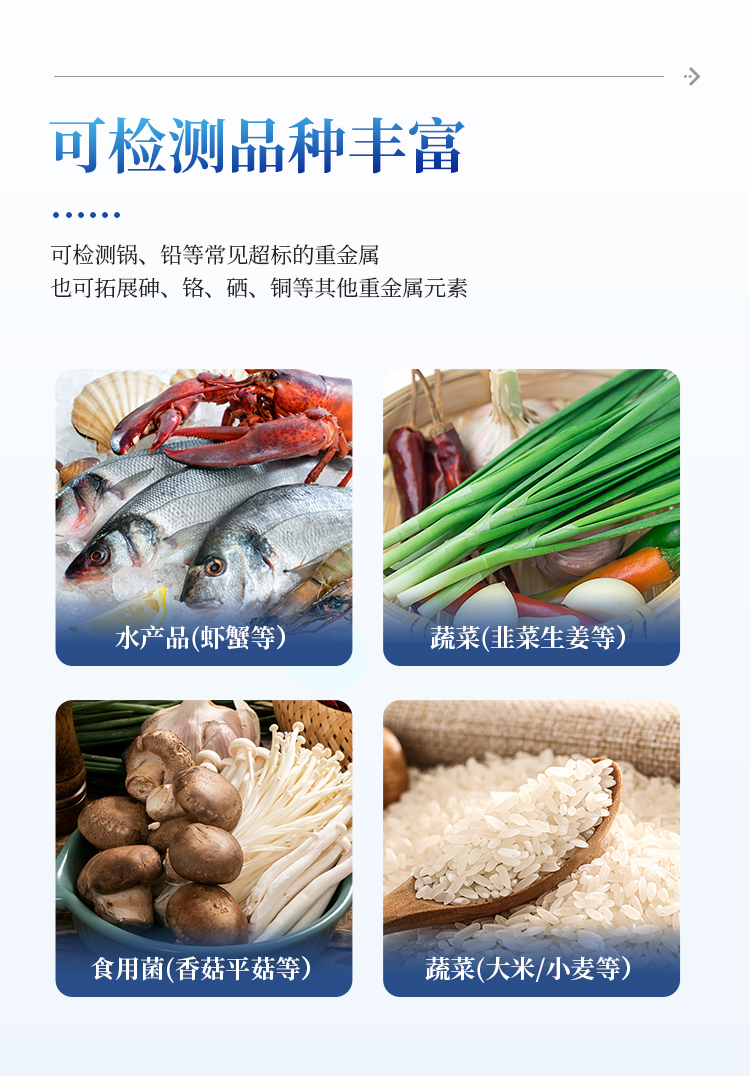 6、可检测镉、铅等常见超标的重金属,也可拓展砷、铬、硒、铜等其他重金属元素。