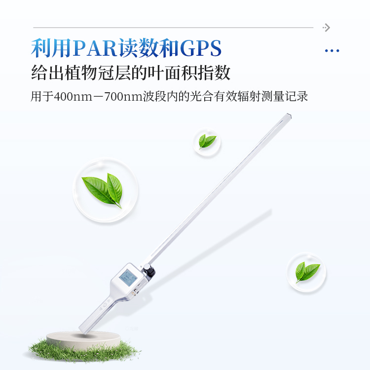 手持冠层分析仪可广泛应用于农业生产和农业科研,为进行冠层光能资源调查,测量植物冠层中光线的拦截,研究作物的生长发育、产量品质与光能利用间的关系,本仪器用于400nm-700nm波段内的光合有效辐射(PAR)测量、记录,测量值的单位是平方米·秒上的微摩尔(μmol/㎡s)。同时使用PAR读数和GPS定位信息等参数可给出植物冠层的叶面积指数(LAI)。