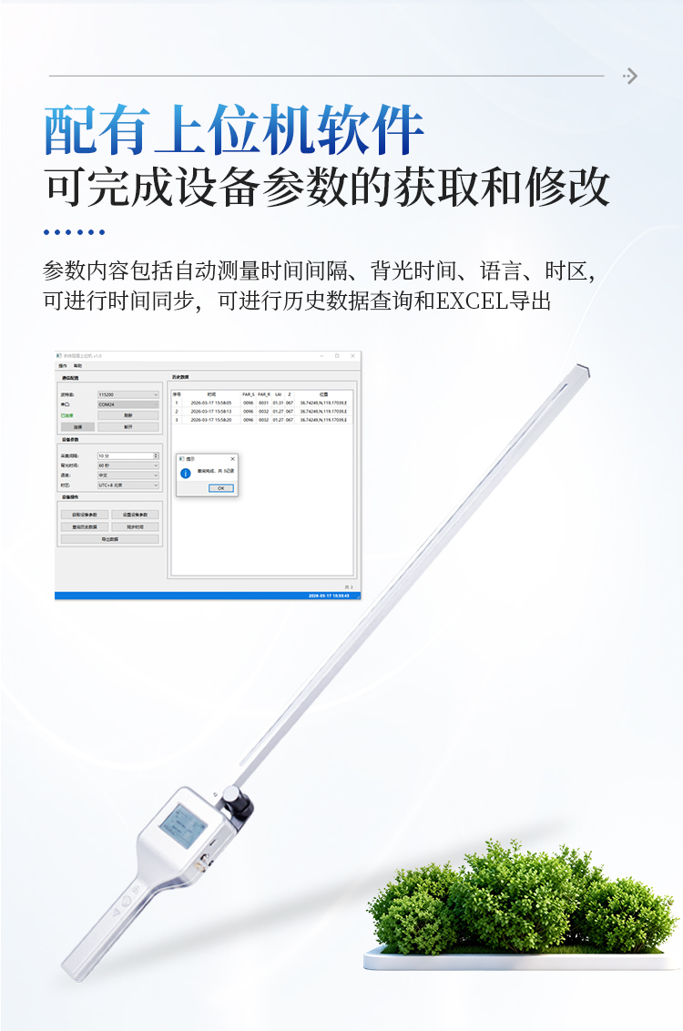 手持冠层分析仪为一体化设计,包括液晶显示屏、操作按键、存储SD卡、探杆传感器、外部传感器等。仪器菜单操作简单,体积小,携带方便。数据保存有SD卡和无线上传(选配)两种存储方式,SD卡为市场通用型卡,存储容量大,数据管理方便;无线上传联网速度快,网页可清晰查看测量的PAR值、LAI值、天顶角及GPS定位信息。功耗有合理的电源管理方案,测试过程中仪器根据实际情况自动进入待机状态,需要时按唤醒键即可唤醒屏幕,观察实际数据。测量方式分为自动和手动两种,自动测量时间间隔最小1分钟,最大60分钟,自动测量次数最大999次;手动测量根据实际需要手动采集即可。