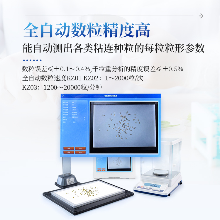 3、★全自动数粒速度1200~20000粒/分钟,数粒误差≤±0.1~0.4%,极少监视修正即达100%正确。全自动千粒重分析的精度误差≤±0.5%。对于直径较小的种粒(如油菜籽、蔬菜籽),单批次考种数量在1~10000粒。
