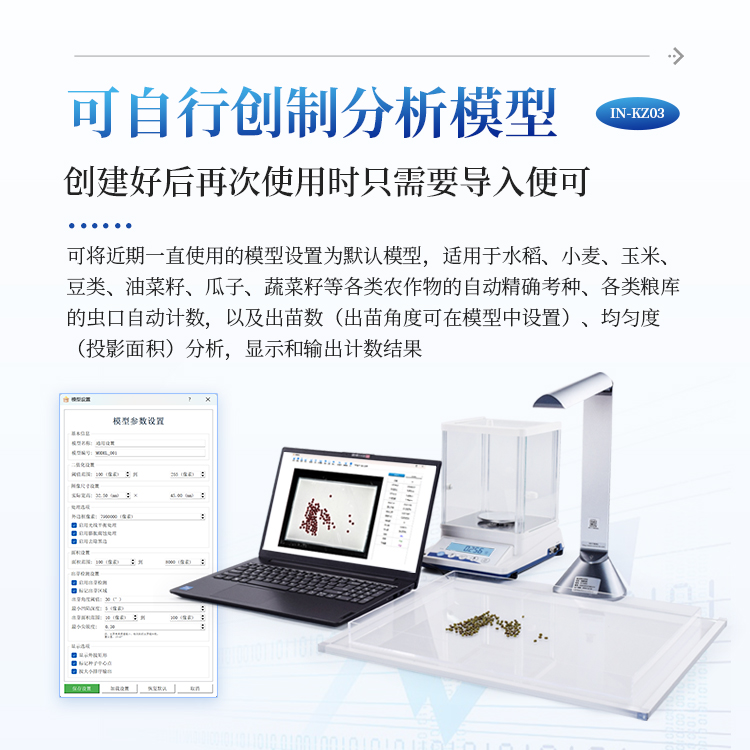 4、★可根据实际需求自行创制分析模型,创建好后再次使用时只需要导入便可,还可将近期一直使用的模型设置为默认模型,适用于水稻、小麦、玉米、豆类、油菜籽、瓜子、蔬菜籽等各类农作物的自动精确考种、各类粮库的虫口自动计数,以及出苗数(出苗角度可在模型中设置)、均匀度(投影面积)分析,显示和输出计数结果。