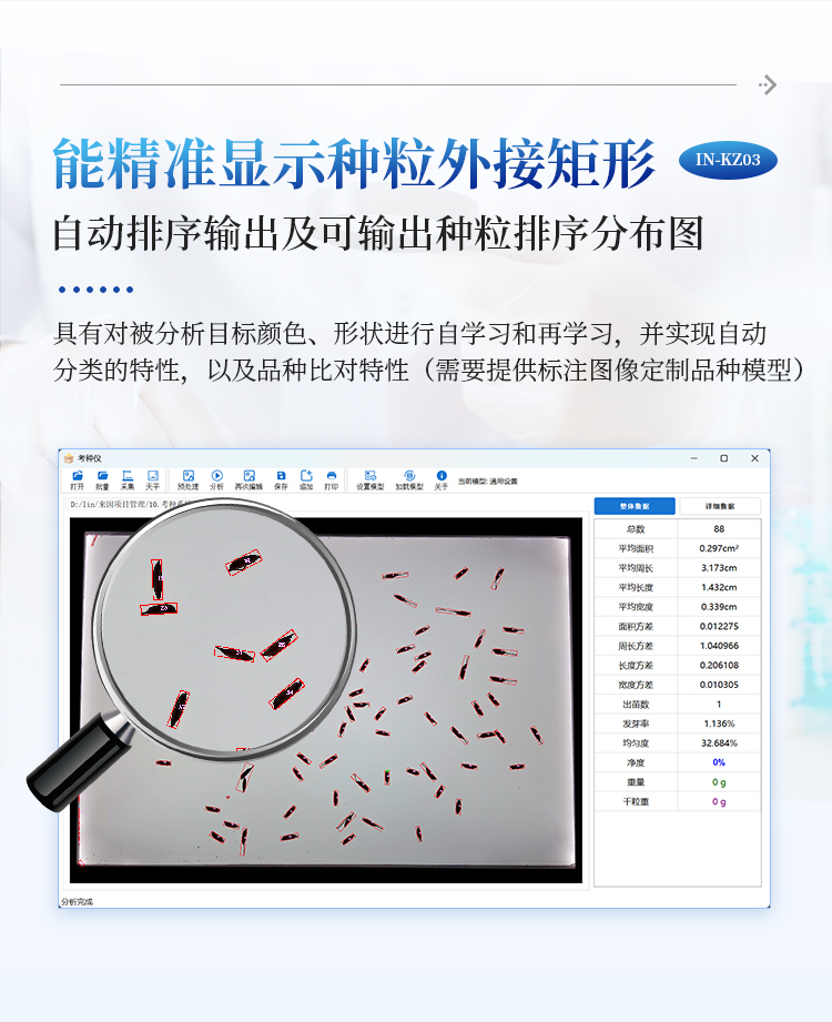 5、★能自动测出各类粘连种粒的每粒粒形参数(长、宽、长宽比、面积、等效直径[种粒面积对应圆直径]、周长等),能精准显示种粒外接矩形,并可自动排序输出及可输出种粒排序分布图。