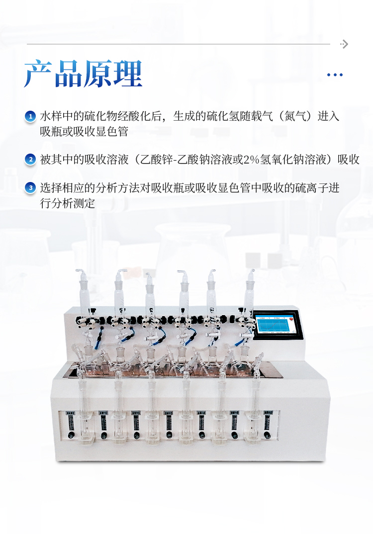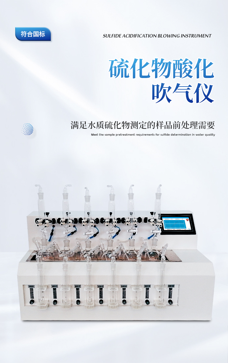 水质硫化物酸化吹气仪根据水质硫化物的测定-亚甲基蓝分光光度法(碘量法)标准开发生产的。满足水质硫化物测定的样品前处理需要。