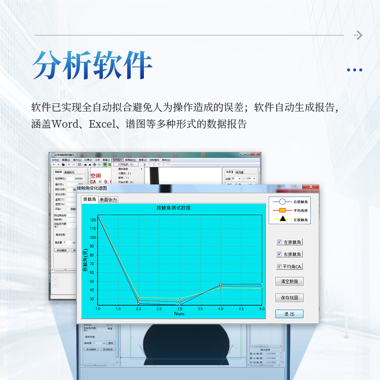 | 动态接触角拟合 | 批量截图拟合、视频连续自动拟合、自动在线实时拟合 |