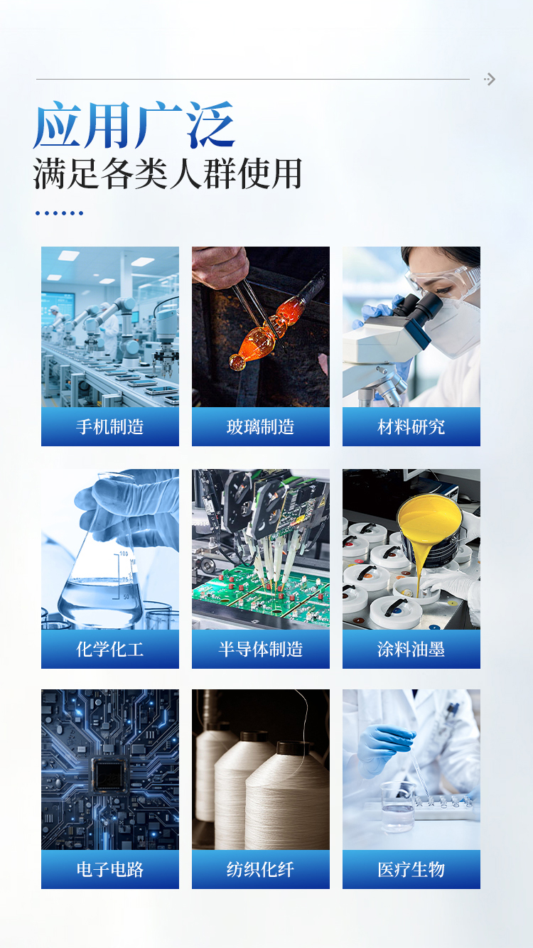 接触角测量仪广泛应用于各个行业领域,在手机制造、玻璃制造、表面处理、材料研究、化学化工、半导体制造、涂料油墨、电子电路、纺织纤维、医疗生物等领域,接触角测量已经成为了一项评估表面性能的重要仪器。(部分测试功能需要选购专门附件完成)