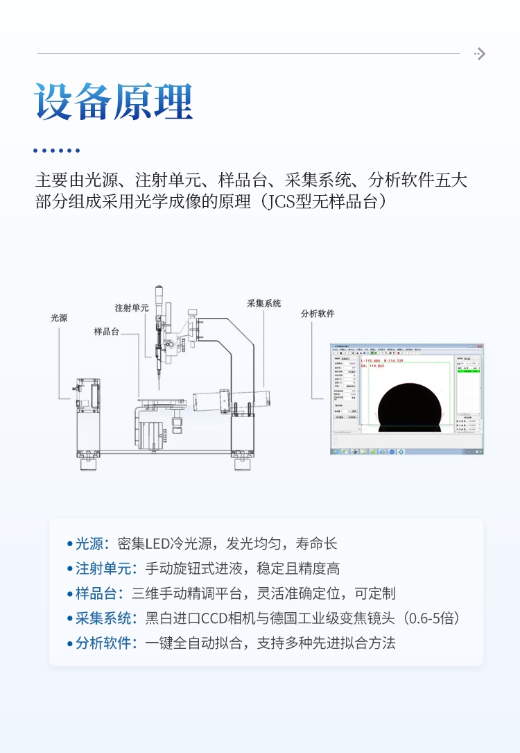 如上图、接触角测量仪主要由光源、注射单元、样品台、采集系统、分析软件五大部分组成,设备采用光学成像的原理。