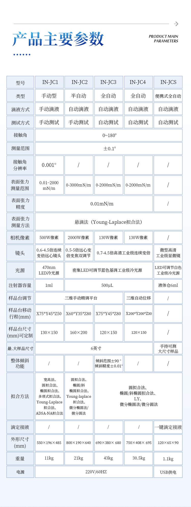 | 测试液滴状态 | 悬滴法(Pendant Drop)、停滴法(Sessile Drop)(2/3态)、掳泡法、座滴法、座针法 |