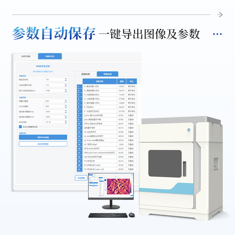 简要描述: 叶绿素荧光成像系统是一款专业的植物光合作用研究仪器,采用高灵敏度CMOS相机和LED光源控制,实现对植物叶片叶绿素荧光的快速、无损检测与成像分析。系统集成了OJIP快速荧光动力学测量和PAM调制荧光测量两大核心功能,能够全面评估植物光合系统的活性、光能利用效率以及环境胁迫响应。 本系统采用模块化设计,软硬件高度集成,配备友好的图形化操作界面,支持中英文双语切换,可广泛应用于植物生理学、生态学、农业科学、环境科学等领域的科研与教学。