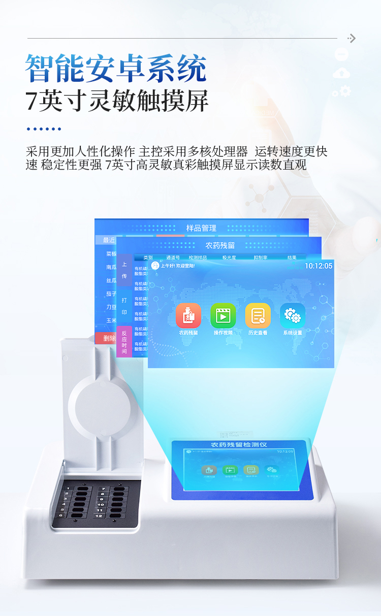 广泛应用于主要用于蔬菜、水果、茶叶、粮食、农副产品等食品中有机磷和氨基甲酸酯类农药残留的快速检测;此外还可用于果蔬茶生产基地和农贸批发销售市场现场检测,餐馆、学校、食堂、家庭果蔬加工前的安全速测等。