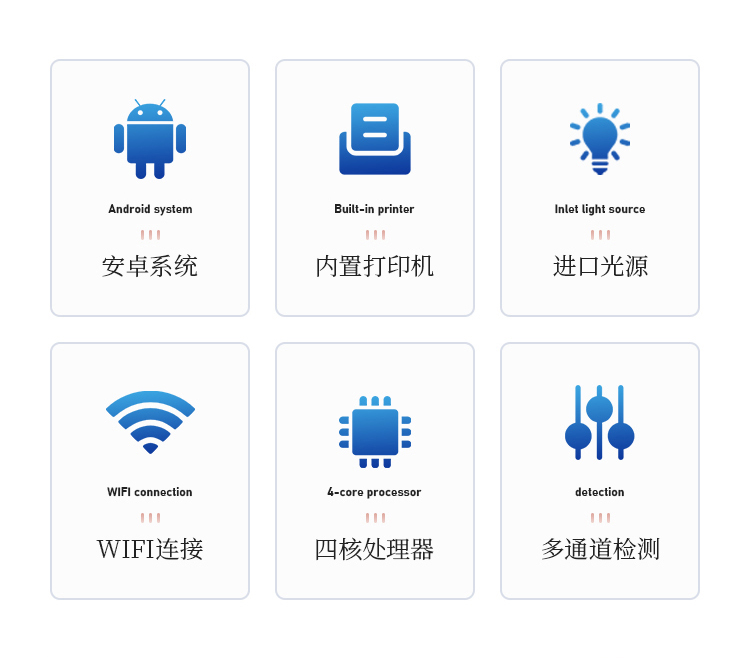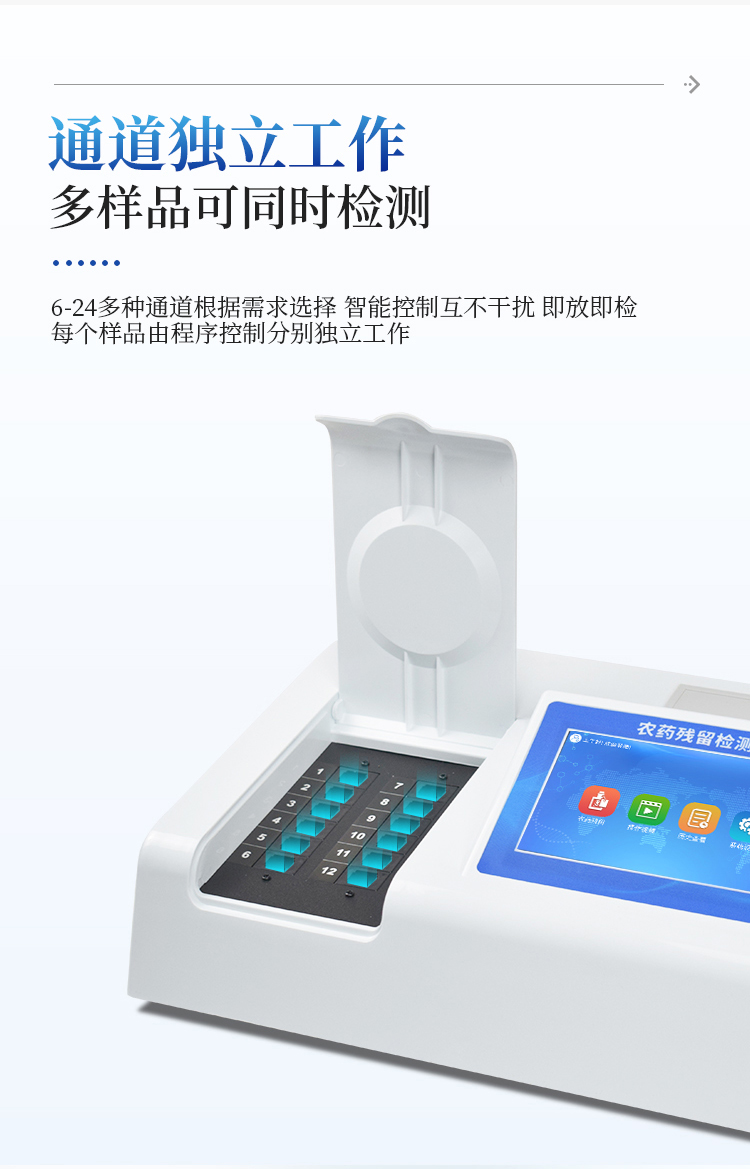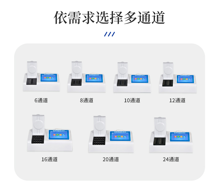 4、检测通道:24个检测通道,可以同时测试多个样品,循环检测,即放即检,每个样品由程序控制分别独立工作,不会互相干扰。
