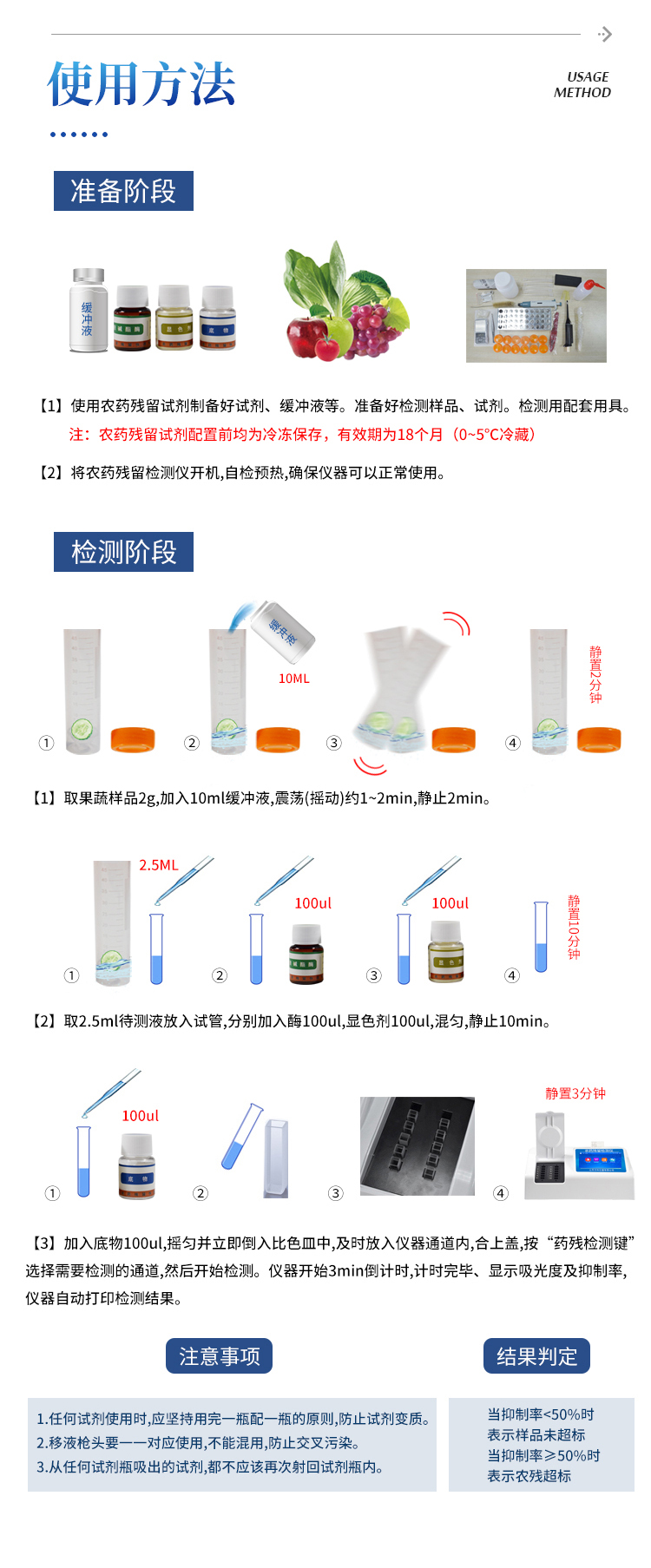 检测标准:依据国家标准方法(GB/T5009.199-2003)以及世界卫生组织WHO、世界粮农组织FAO残留农药检测标准、世界环境保护局EPA参照摄入量等要求来设计。采用酶抑制率比色法对水果、蔬菜等农林产品中有机磷和氨基甲酸酯类农药含量进行快速准确的检测。