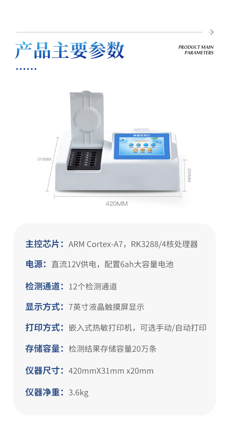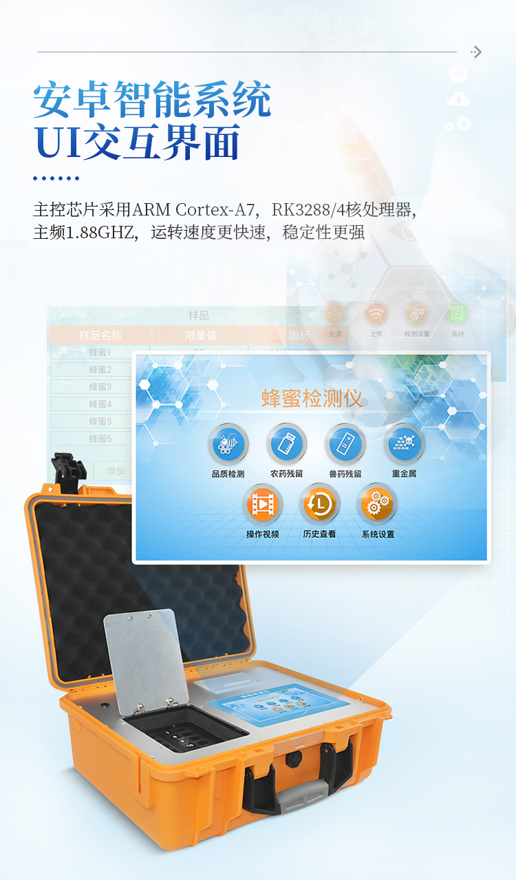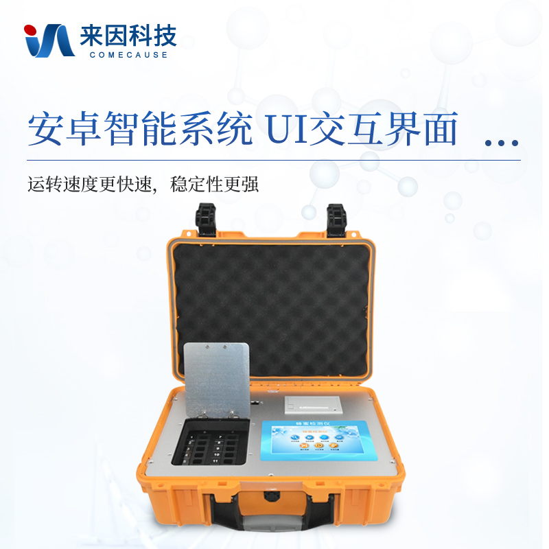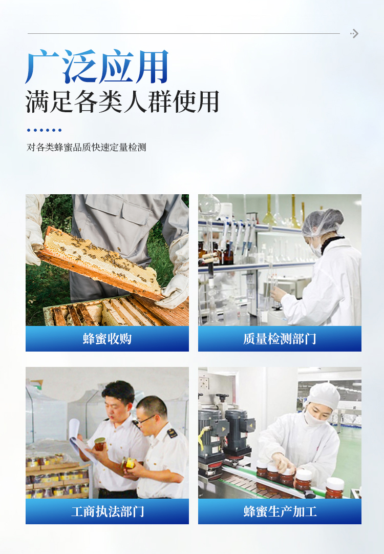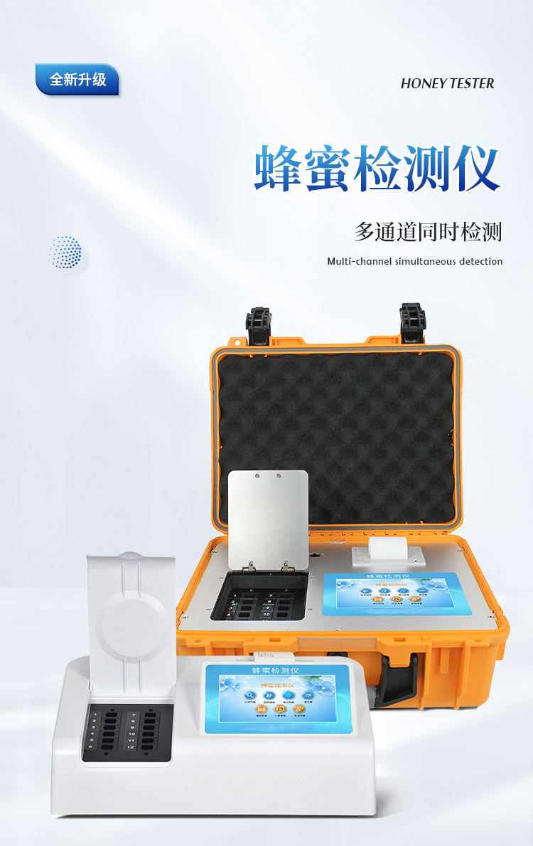 检测项目:蜂蜜蔗糖、蜂蜜还原糖(葡萄糖和果糖)、蜂蜜羟甲基糠醛、蜂蜜酸度、蜂蜜中农药残留、蜂蜜淀粉酶值、蜂蜜中脯氨酸、蜂蜜水分、蜂蜜糖分、蜂蜜中重金属(铅、镉、汞)、蜂蜜中抗生素(氯霉素、四环素、磺胺类、呋喃类、喹诺酮类)、蜂蜜中灰分,应用范围:应用于现场检测蜂蜜蔗糖、葡萄糖和果糖、羟甲基糠醛、酸度、农残、淀粉酶、脯氨酸、水分、糖分、重金属、抗生素、灰分含量的蜂蜜快速检测仪,可广泛应用于各类蜂蜜品质的快速定量检测。