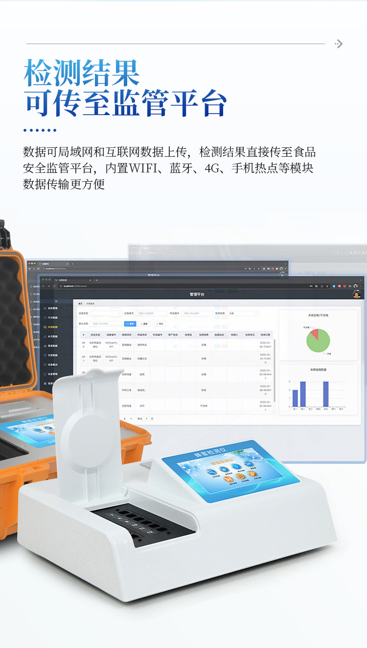 4、仪器带有监管平台,数据可局域网和互联网数据上传,检测结果直接传至食品安全监管平台。进行区域食品安全监管及大数据分析处理与数据统计,检测区域食品安全长短期动态,达到食品安全问题预估、预警