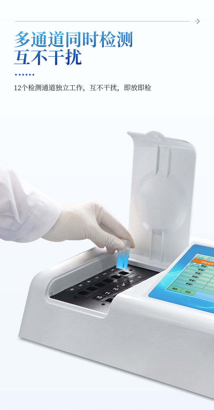 9、仪器具有多品类多种类样品菜单库,可灵活选择检测样品,不同的检测通道可同时检测不同的样品项目。也可在仪器上直接编辑录入样品名称、检测指标、送检单位等信息并保存进样品数据库。